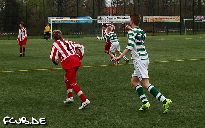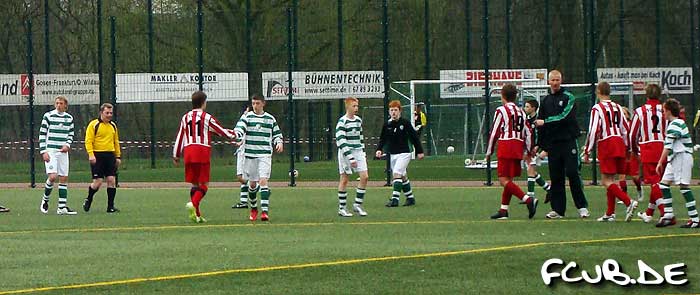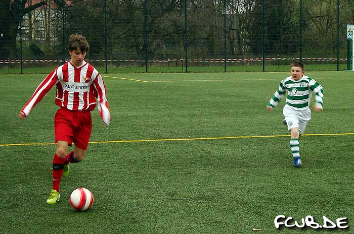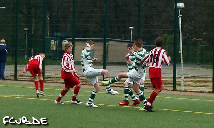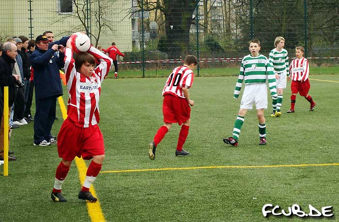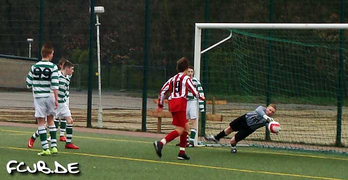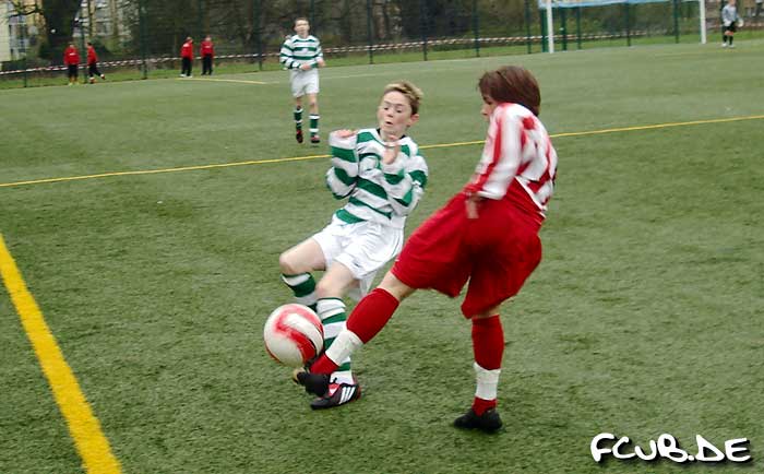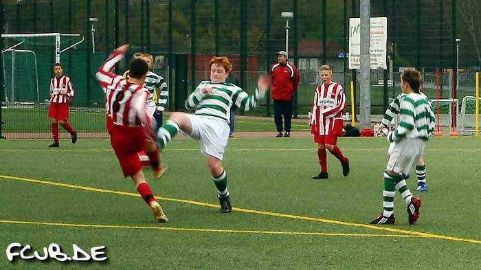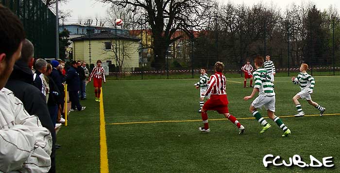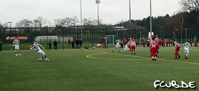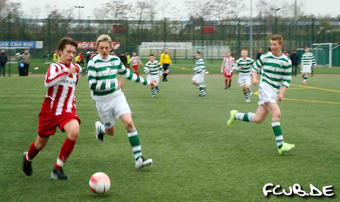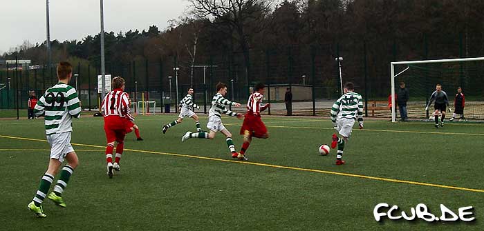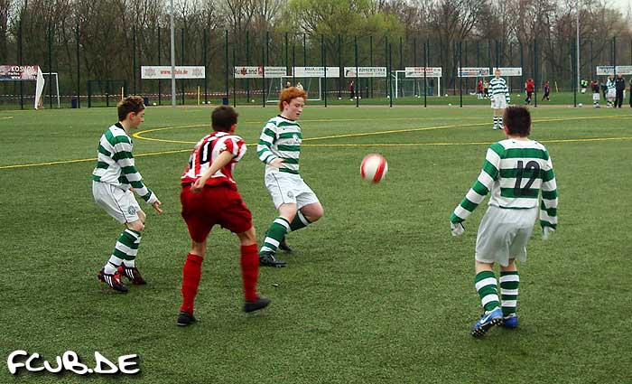 Sie waren schneller, technisch versierter, gedanklich stets und ständig schon einen Spielzug weiter und hatten auch im Körperspiel so gut wie keine Nachteile. Nun hab ich vom schottischen Nachwuchsfußball natürlich überhaupt keine Ahnung, aber ein wenig mehr „Talent“ hätte ich einem so internationalem Namen wie Celtic schon zugetraut. Aber gegen das Kurzpassfestival der jungen Unioner, gepaart mit so manchem technischem Kabinettstückchen, sahen die jungen Bhoys im wahrsten Sinne des Wortes alt aus. Das Ergebnis hätte im Endeffekt auch locker doppelt so hoch ausfallen können, wenn nicht sogar müssen – aber nennen wir es einfach mal Gastfreundlichkeit, dass die Jungs viele klare Chancen liegen ließen. Erwähnenswert eventuell noch, dass die jungen Schotten zwar bei aller Fairness schon ne harte Gangart an den Tag legten, die Unioner aber den meisten Grätschen durch ihre Schnelligkeit und solider Gewandtheit aus dem Weg gehen konnten, so dass die Bhoys doch öfters ins Leere rutschten.