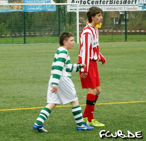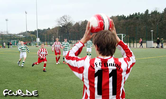 Internationale Testspiele sind ja immer etwas Besonderes. Da machen auch internationale Testspiele im Jugendbereich keine Ausnahme und so war natürlich auch der Kick unserer C-Jugend gegen ein Team von Celtic Glasgow heute Nachmittag schon was Außergewöhnliches. Also nach der Schicht schnell mal rangefahren. Außer das unsere 1.C in der aktuellen Saison in der höchsten Berliner Spielklasse nur ne mittelmäßige Rolle spielt, ist mir (zugegeben) nicht viel bekannt. Dennoch war ich etwas überrascht, dass – als ich 10 Minuten zu spät eintraf – unsere Jungens schon mit 1:0 führten. In der Folge sollte diese Überraschung aber mehr und mehr ein klein wenig Stolz weichen, denn die kleinen Unioner hatten die Gäste aus Schottland über die gesamte Spielzeit fest im Griff.