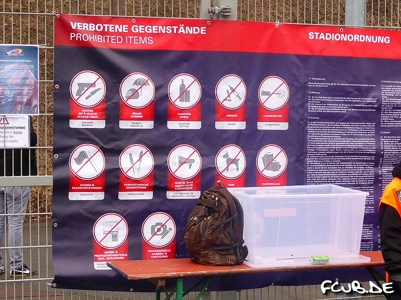 Die Straßenbahn kommt am Zentralstadion an, zahlreichen Familien steigen mit uns aus. Das Bild des RB-Mitläufers wird sich bis nach Spielende nicht mehr ändern. Keine Naziprolls und auch keine Connewitzer Studenten. Einfach nur stinknormale Langeweiler, die einfach völlig wertefrei Fußball kieken wollen. Ideales Stimmvieh. Nichts hinterfragen, hingehen, Schal kaufen, setzen, warten was passiert. Es ist das perfekte Publikum für diese Idee, dort in Leipzig. Und wie sehr man dort im Zentralstadion bei Null anfängt, sieht man spätestens am ersten Eingang, wo auf nicht zu übersehenden Folien umfangreich aufgezählt wird, was nicht in das Stadion mitgenommen werden darf. Ob sich in Leipzig jemand daran stört, dass dort Fahnen und Papierrollen mit Schusswaffen und Drogen gleichgesetzt werden? Tiere dürfen auch nicht rein. Wer hätte das gedacht?!