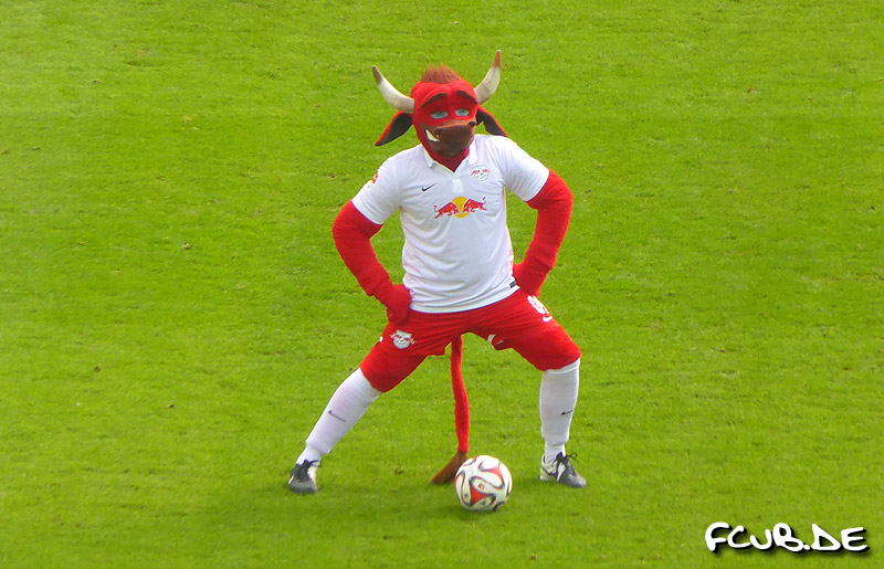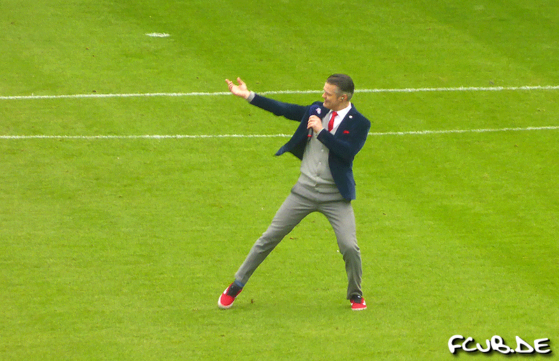 Wir nahmen unsere Plätze ein, und achteten auch streng darauf, dass wir die richtigen Sitze belegten. Immerhin befanden wir uns mitten im Feindesland (auf mehreren Ebenen), was aber – wie wir spätestens nach dem ersten Union-Treffer feststellten – bereits großräumig unterwandert war. Es gab… ja doch, überraschend angenehme Musik, überhaupt nicht ZU aufdringliche Beschallung, bis… ja bis dieser – nun, trifft es Kasperkopp eigentlich noch richtig? – den Rasen betrat. Es folgte ein Auftritt wie… ach, warum soll ich mich abmühen und Vergleiche suchen?! Ich habe so was noch nie erlebt. Ich meine, die ehemaligen Bundesligisten, die wir bisher so oder so erlebten (Cottbus, Hertha, Lautern ect) hatten alle ihre eigene, des breiten Eventpublikums geschuldeten vermeintlichen Stimmungsknaller. Aber was der da abzog… Und alles, alles, alles klang und sah von vorne bis hinten so durchgezeichnet, vorgegeben und abgesegnet aus, wie ich es mir in den schlimmsten Träumen vorher nicht ausgemalt hätte. Selbst von der zwingenden Dreifachnennung des Torschützen, bis zum (mit dramatischer Pause vor dem) sachlich neutral gesagten „FC Union Berlin“, nach dem hinaus posaunten „eeeR Beee LEIIIIPZIIIIIG“, war alles an (als unabdingbares Klischee gedachtes und auf dem Reißbrett auf das RB-Publikum zugeschnittenes) Event-Gedöhns am Start. Es wurde wirklich NICHTS ausgelassen. Selbst das Fehlen der Cheerleader passte perfekt.