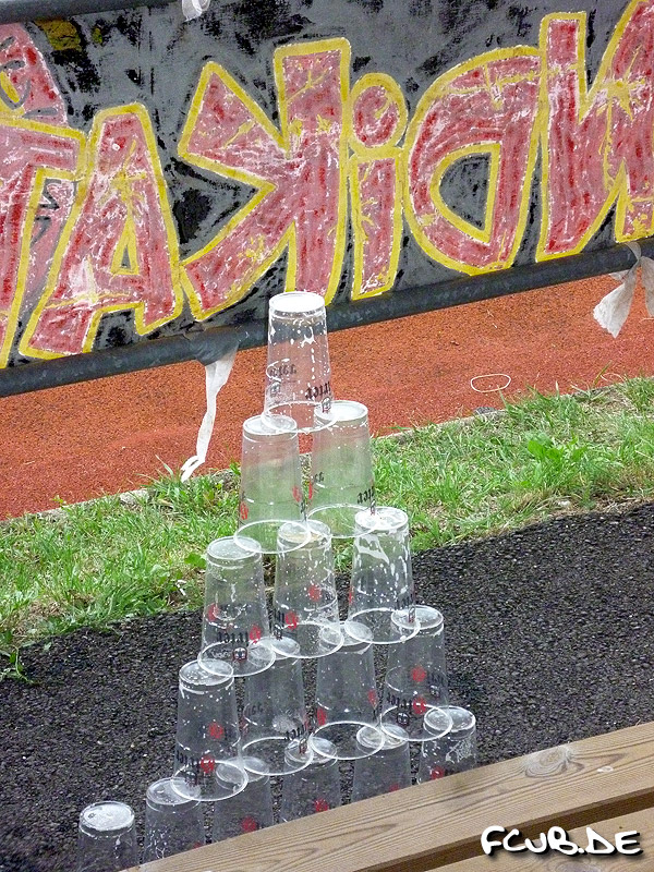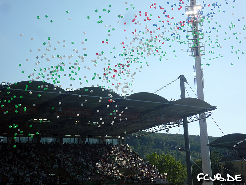 Mit den FUDU-Piefkes in Völkermarkt war Holger (Eisener Messias)Normalerweise beginnt eine Saison des 1.FC Union Berlin ja mit dem Besuch des Trainingsauftakts im Stadion ADAF. In diesem Jahr war dies leider nicht möglich, da das Spielfeld des selbigen mit Sitzgelegenheiten bestückt war und dem Leitspruch „Fußball pur!“ dank Samba-Tänzerinnen und Lampen-La-Olas ordentlich Leben eingehaucht wurde. So saßen sie nun dort, um der FIFA-Weltmeisterschaft („Wir verkaufen unsere Seele – aber nicht an jeden!“) zu frönen und der deutschen Nationalmannschaft („Fick Dich, DFB!“) kräftig die Daumen zu drücken. Unsereins zog kopfschüttelnd von dannen und stellte sich die Frage, warum man einst zum Stadionbesitzer wurde, wenn doch dieses 500 € teure Stück Papier nur wenige Jahre später nicht einmal dazu berechtigt, mitzudiskutieren, wie unser Stadion in der Sommerpause genutzt werden darf. Und eine Diskussion über das Für und Wider einer solchen Veranstaltung wäre bei der Meinungsdivergenz innerhalb der Fanszene hinsichtlich dieses Events sicherlich von Nöten gewesen. Sie hätte zumindest verhindert, dass manche Menschen, die schon seit Jahren den 1. FC Union begleiten, das Gefühl vermittelt bekommen, ihr Wort habe plötzlich kein Gewicht mehr. Niemand mag sich wie eine austauschbare Figur in einem immer größer werdenden und nach oben strebenden Verein, der bereits das Unwort „Kapitalgesellschaft“ in den Mund nimmt, fühlen...
