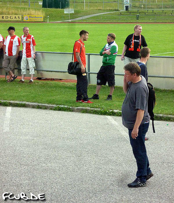 In der zweiten Halbzeit verliert das Spiel etwas an Tempo. Beiden Mannschaften wechseln in der Pause nicht komplett durch, sondern bringen nach und nach vereinzelt Reservespieler in das Spiel. Bei Union kommen im Verlauf der Partie noch Leistner, Brandy, Özbek, Kopplin, Parensen, Gomaa, Dausch und Nebihi zum Einsatz. Verständlich, dass der Rhythmus eines Spiels durch solche Wechselarien ein wenig ins Stocken gerät. Positiv bleibt, dass sich der WAC, der bereits in einer Woche in die Saison startet und sich somit in einer gänzlich anderen Phase der Saisonvorbereitung befindet, kein Übergewicht verschaffen kann. Weder körperlich noch taktisch sind sie den Unionern überlegen, sodass es den schwarz gekleideten Unionern gelingt, die 1:0 Führung zu verteidigen. Das Sahnehäubchen auf diese gute Leistung setzt am Ende Youngstar Zejnullahu, der einen Konter zum 2:0 abschließen kann. Das hat Spaß und Vorfreude auf mehr gemacht! Wir bitten vor der Abfahrt aus Völkermarkt den etwas verwirrten Dirk Zingler noch eben schnell, ein Foto VON uns zu machen. Wer zu oft fotografiert wird, verlernt das fotografieren. Oder: FUDU-Tours erdet!
