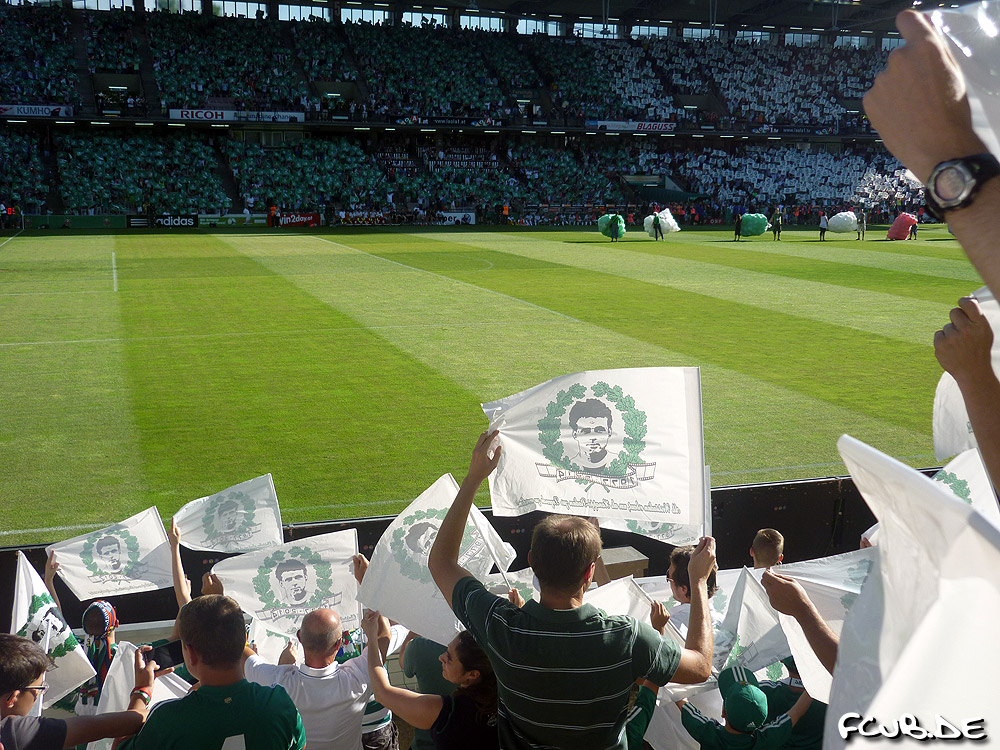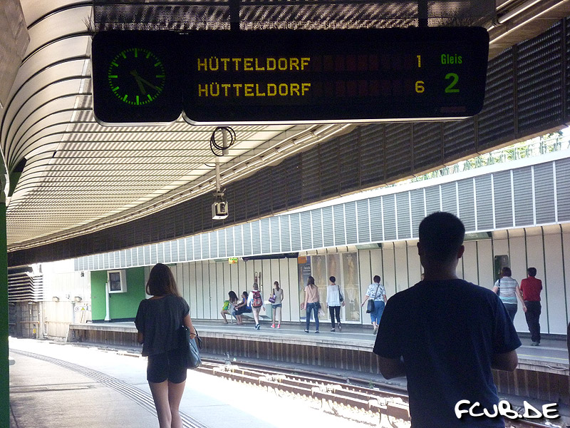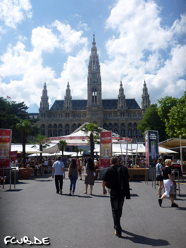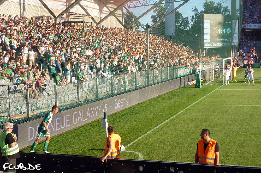 Und durch Schlusspfiff und Fotoaktion sollte unser Wochenende noch längst nicht beendet sein. Den Sonntag verbrachten Teile der Reisegruppe zunächst mit einem ausgiebigen Wien-Spaziergang. Dort, wo die Wiener wohnen, sieht Wien aus wie Neukölln. Urban, ein bisschen schmuddelig, Sprachenmelange vom Balkan, hier und da etwas morbide. Das Stadtzentrum ist jedoch schick angezogen: Stephansdom, Wiener Staatsoper, Burgtheater, Rathaus, Hofburg. Und auch das Schloss Schönbrunn, außerhalb des Stadtzentrums auf dem Weg ins Gerhard-Hanappi-Stadion gelegen, kann einem ein touristisches "Oooh, schön!" entringen. Apropos auf dem Weg zum Stadion gelegen: Es muss der verehrten Leserschaft nicht verschwiegen werden, dass der Hauptgrund für ein Verweilen in Wien im Aufeinandertreffen von Rapid Wien und Celtic Glasgow zu suchen ist. Das Freundschaftsspiel der beiden europäischen Clubs wird in die Geschichtsbücher eingehen, ist es doch das letzte Fußballspiel im o.g. Stadion, ehe dieses dem Erdboden gleich gemacht und durch eine 0815-Standard-Arena an gleicher Stelle ersetzt wird.
