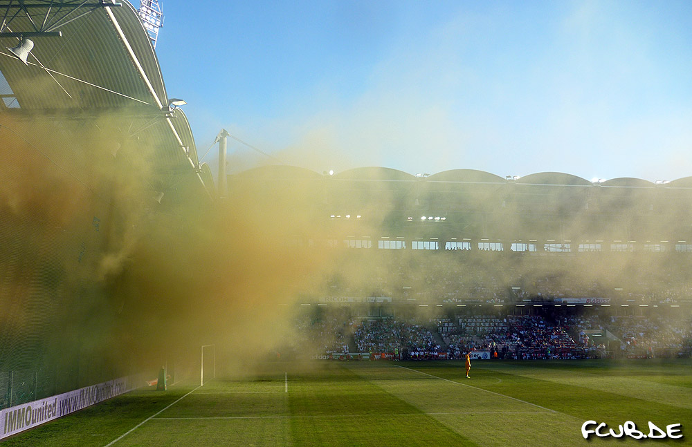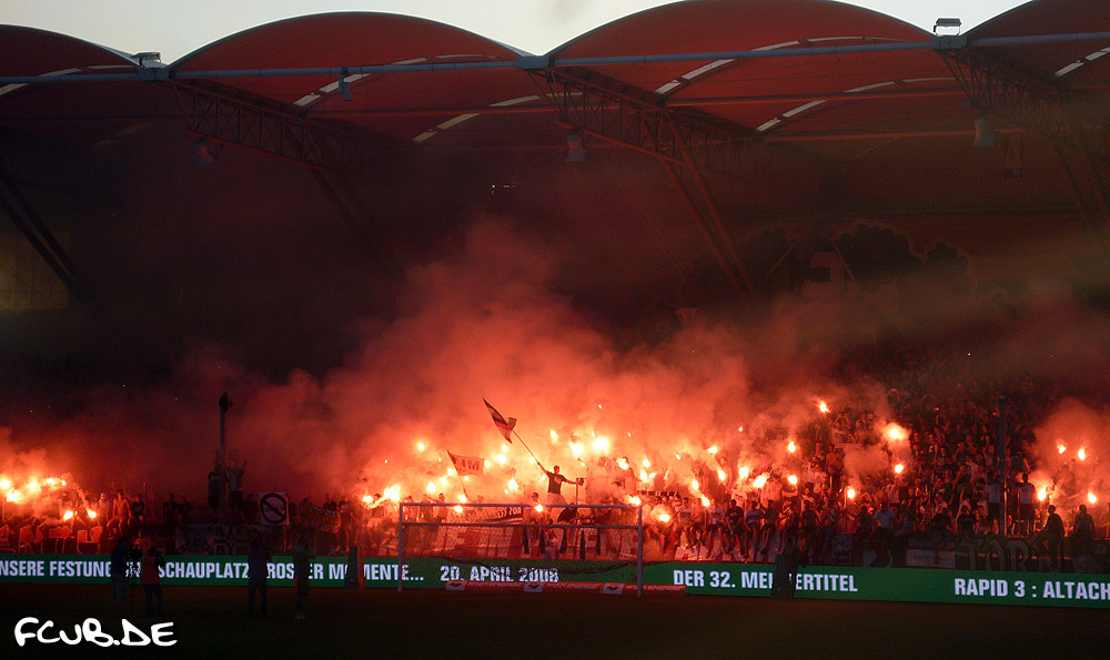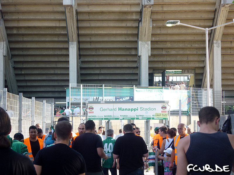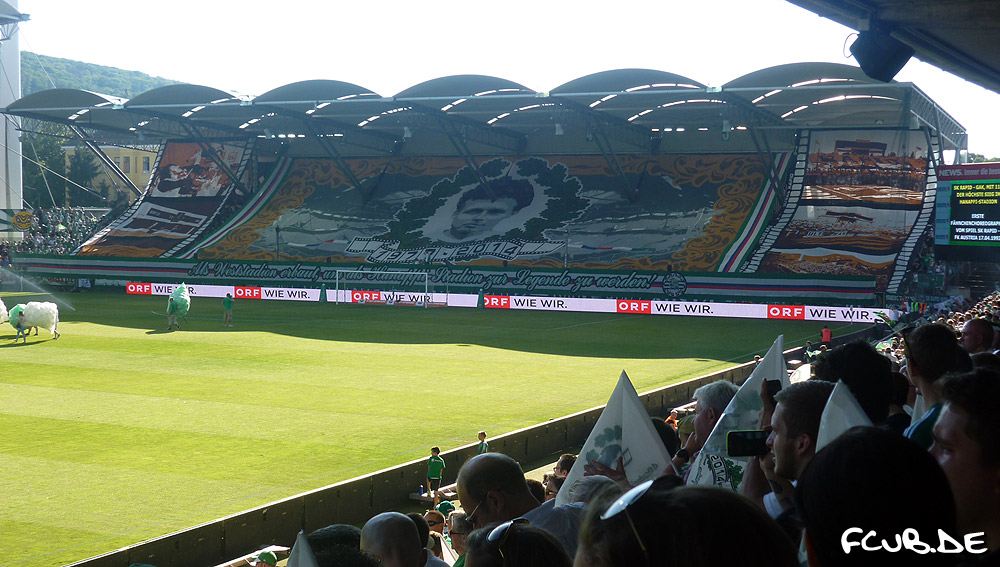 So war es nicht verwunderlich, dass das Spiel zur Randerscheinung wurde und der Schwerpunkt der Beobachtung auf das Stadion und das Drumherum gelegt wurde. Für FUDU und einige andere Unioner, die ebenso wie wir aus Völkermarkt nach Wien gefahren waren, hieß es nun: Noch schnell die Atmosphäre der Flutlichtmasten einatmen, die schöne Dachkonstruktion der Marke Übergangslösung bestaunen, das kleine, enge Fußballstadion ohne VIP-Schnickschnack bewundern und etliche emotionale Momente einfangen. Die alten Rapid-Recken auf dem Rasen, inklusive Antonin Panenka, die wehmütig weinenden Männer um uns herum auf den Traversen, 90 Minuten Pyrotechnik, das Einläuten der Rapid-Viertelstunde, eine sensationelle Choreographie mit den wichtigsten Momenten der Vereinsgeschichte, Fähnchen mit dem Konterfei Gerhard Hanappis - all diese Eindrücke ließen den Besuch des Spiels schnell in die Kategorie "lohnenswert" rutschen. Nebenbei spielten beide Vereine übrigens 1:1 - aber das interessierte kaum einen der 17.400 Zuschauer, von denen eine Vielzahl nach Abpfiff den Rasen stürmten und Abschied von ihrem geliebten Stadion nahmen.